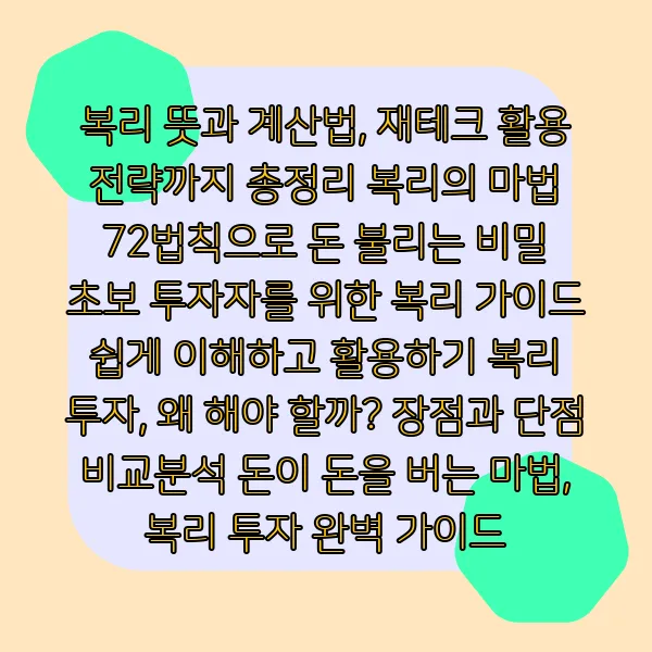 돈이 눈덩이처럼 불어나는 마법, 복리! 📈 시간이 돈을 벌어다 주는 마법 같은 투자 전략, 복리의 세계에 흠뻑 빠져볼 준비되셨나요? 🤔 복리의 개념부터 계산법, 72법칙 활용, 재테크 전략, 장단점 비교, 그리고 성공적인 투자를 위한 꿀팁까지 아낌없이 공개합니다! ✨ 복리 투자, 이제 막 시작하는 초보 투자자도 완벽하게 이해하고 활용할 수 있도록 꼼꼼하게 가이드 해드릴게요!💯