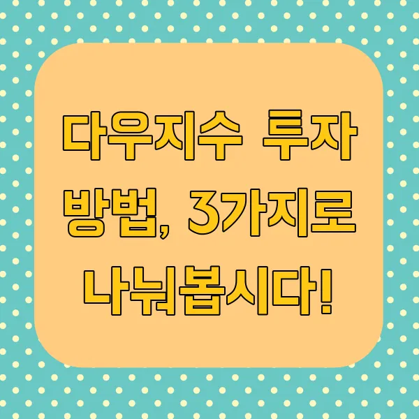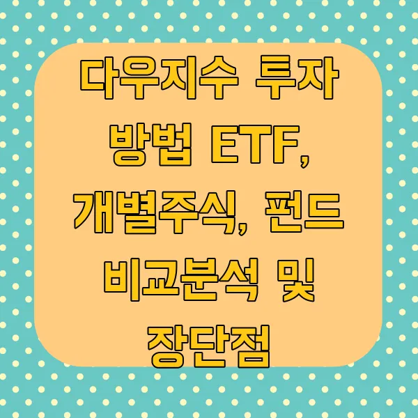 다우지수에 투자하는 방법은 크게 ETF, 개별 주식, 펀드로 나눌 수 있습니다. 각 방법의 특징과 장단점을 비교하여 자신에게 맞는 투자 전략을 세워보세요!